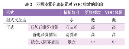 無論選用哪種形式的漆霧分離裝置,最終都將產(chǎn)生漆霧捕捉媒介與過噴漆霧的混合物,假設(shè)該混合物在收集后可以做到密閉保存、運(yùn)輸,那么最終混合物內(nèi)的VOC含量就是漆霧分離裝置對噴漆系統(tǒng)的VOCs減量。不同漆霧分離裝置對VOCs排放的影響見表2。