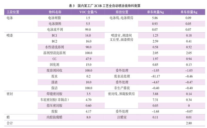 表3統(tǒng)計了該車間內(nèi)所有含VOC原料的單車耗量,以及所有委外廢棄物、非生產(chǎn)排放物的VOC含量,最終得到正常滿產(chǎn)期間單車VOC排放量約為2.8 kg/h。該車間滿產(chǎn)節(jié)拍為40臺/h,合計總排放速率為112 kg/h。