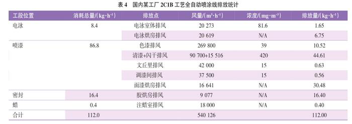 為了明確油漆車間各工藝環(huán)節(jié)的實際排放情況,本文就國內(nèi)某工廠2C1B工藝全自動噴涂線的實際情況做了以下實測統(tǒng)計。