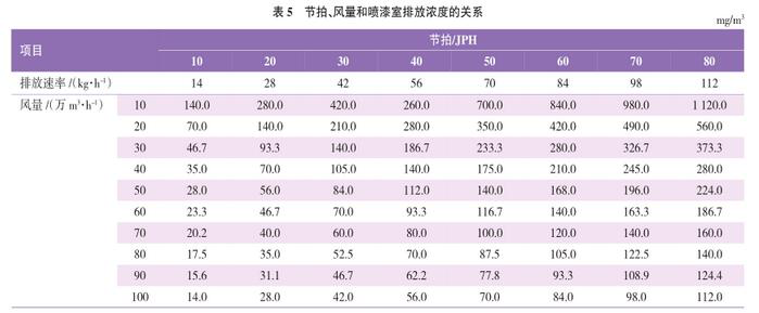 我們繼續(xù)使用表3和表4得出的結(jié)論,假設(shè)采用2C1B工藝后單車VOC排放量為2.8 kg/h,而噴漆室排風(fēng)占總量的一半,達(dá)到單車1.4 kg/h。配合產(chǎn)能信息及噴漆室排風(fēng)量,噴漆室排放濃度與節(jié)拍、風(fēng)量的關(guān)系見表5。