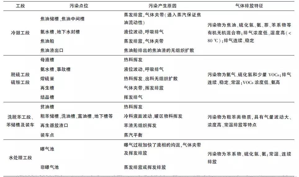 焦化 VOCs廢氣排放點位及產(chǎn)排特征見表