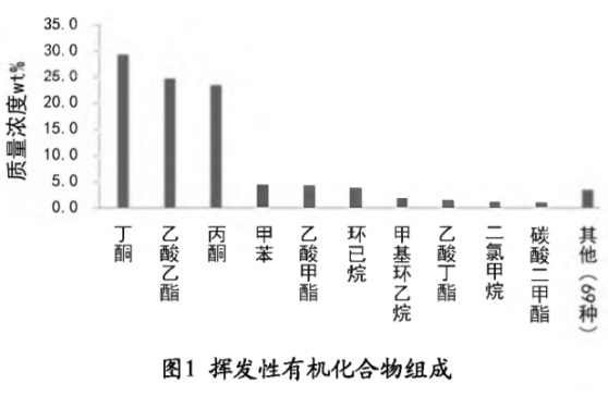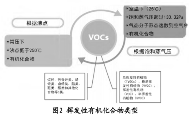 分析發(fā)現(xiàn)VOCs的危害主要表現(xiàn)在大氣環(huán)境(組成成分與類(lèi)型見(jiàn)圖1、2),具體表現(xiàn)為兩點(diǎn):首先VOCs具有光化學(xué)特點(diǎn),受到太陽(yáng)光、熱條件作用,N0x、VOCs會(huì)形成不同的光化學(xué)氧化劑。因?yàn)槌粞跽急瘸^(guò)90%,所以臭氧便成為光化學(xué)氧化劑中最為典型的物質(zhì)。臭氧的存在將氧化大氣內(nèi)部SO2,NOx、VOCs氧化,氧化后形成的物質(zhì)會(huì)為二次PM2.5提供必須的陰離子,和大氣內(nèi)部的陽(yáng)離子結(jié)合之后,可以組成無(wú)機(jī)二次PM2.5,與有機(jī)氣溶膠融合,會(huì)形成二次PM2.5;其次,VOCs與光化學(xué)產(chǎn)物屬于毒害物質(zhì),與人體接觸會(huì)危害身體健康。