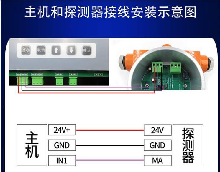 變送器的,“24V+”與控制柜上的“24V+”連接,“GND”與控制柜上的“GND”連接,“mA”與控制柜上的“IN1”連接。
