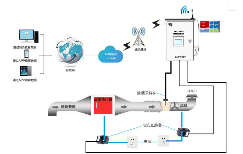 油煙在線監(jiān)測(cè)系統(tǒng)是為了滿足餐飲行業(yè)油煙排放監(jiān)管的需求,利用物聯(lián)網(wǎng)技術(shù)、GPRS無(wú)線通訊及GIS等技術(shù),實(shí)現(xiàn)對(duì)分散餐飲企業(yè)的集中監(jiān)管。系統(tǒng)實(shí)時(shí)監(jiān)測(cè)油煙排放濃度以及凈化器和風(fēng)機(jī)的工作狀態(tài)等信息,結(jié)合餐飲企業(yè)檔案信息管理、智能的數(shù)據(jù)統(tǒng)計(jì)分析及報(bào)警管理功能,為環(huán)境監(jiān)管部門(mén)對(duì)餐飲企業(yè)的管理提供技術(shù)支撐。